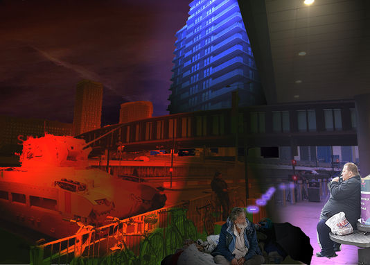 I created a 3D using blender. I used the physics engine in blender to simulate the rubble being hit by the tank shell. Finally I used after effects to create the static at the end of the animation along with the text.